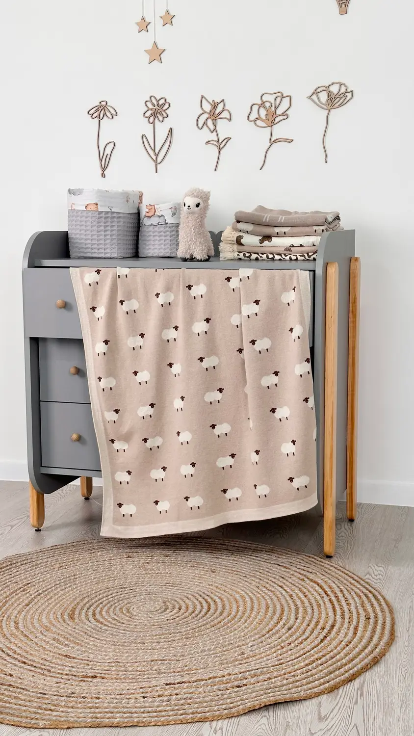 Kocyk z owieczkami, idealny dla dzieci. Wykonany w 100% z bawełny, o wymiarach 80×100 cm.